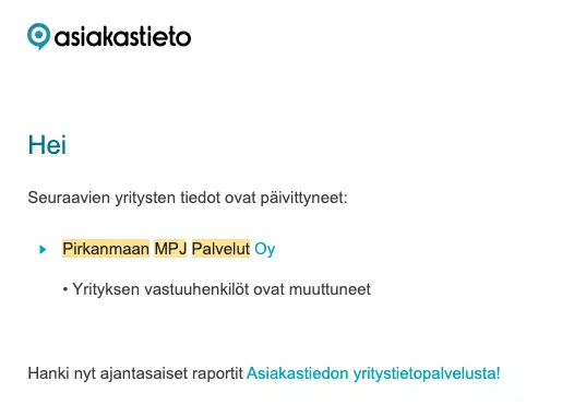 Asiakastieto laittoi siis tÀllaisen pÀivityksen sÀhköpostitse: